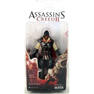 Based on the hit video game! Ezio, the lead character of Ubisofts bestselling Assassins Creed II can be yours with this allnew action figure! This muchrequested fanfavorite stands 7 tall and has over 20 points of articulation. Ezio is available in two different styles Standard (with the white cloak) or Black (with the black cloak). Each figure comes with retractable wrist knives, weapons, and other gameauthentic accessories.